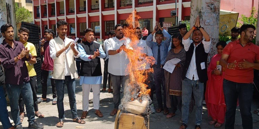 गोपेश्वर (चमोली)। श्रीदेव सुमन विश्व विद्यालय की ओर से घोषित बीए प्रथम सेमेस्टर के परीक्षा परिणामों में भारी त्रुटी के विरोध में शनिवार को अखिल भारतीय विद्यार्थी परिषद के छात्रों ने गोपेश्वर में महाविद्यालय परिसर के सम्मुख विश्व विद्यालय प्रशासन का पुतला दहन किया। तथा मांग की कि अविलंब परीक्षा परिणामों की त्रुटियों में सुधार नहीं किया जाता है तो बड़ा आंदोलन किया जाएगा।