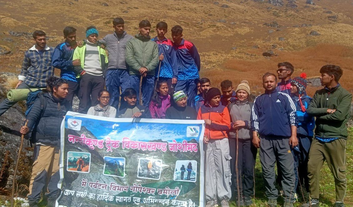 गोपेश्वर (चमोली)। उत्तराखंड पर्यटन विभाग चमोली की ओर से आयोजित साहसिक ट्रैकिंग का 26 सदस्यीय दल 120 किलोमीटर की पैदल दूरी तय करते हुए विभिन्न पडावों से होता हुआ नंदीकुंड पहुंचा। इस 26 सदस्यीय दल में पांच युवतियां भी शामिल थी।