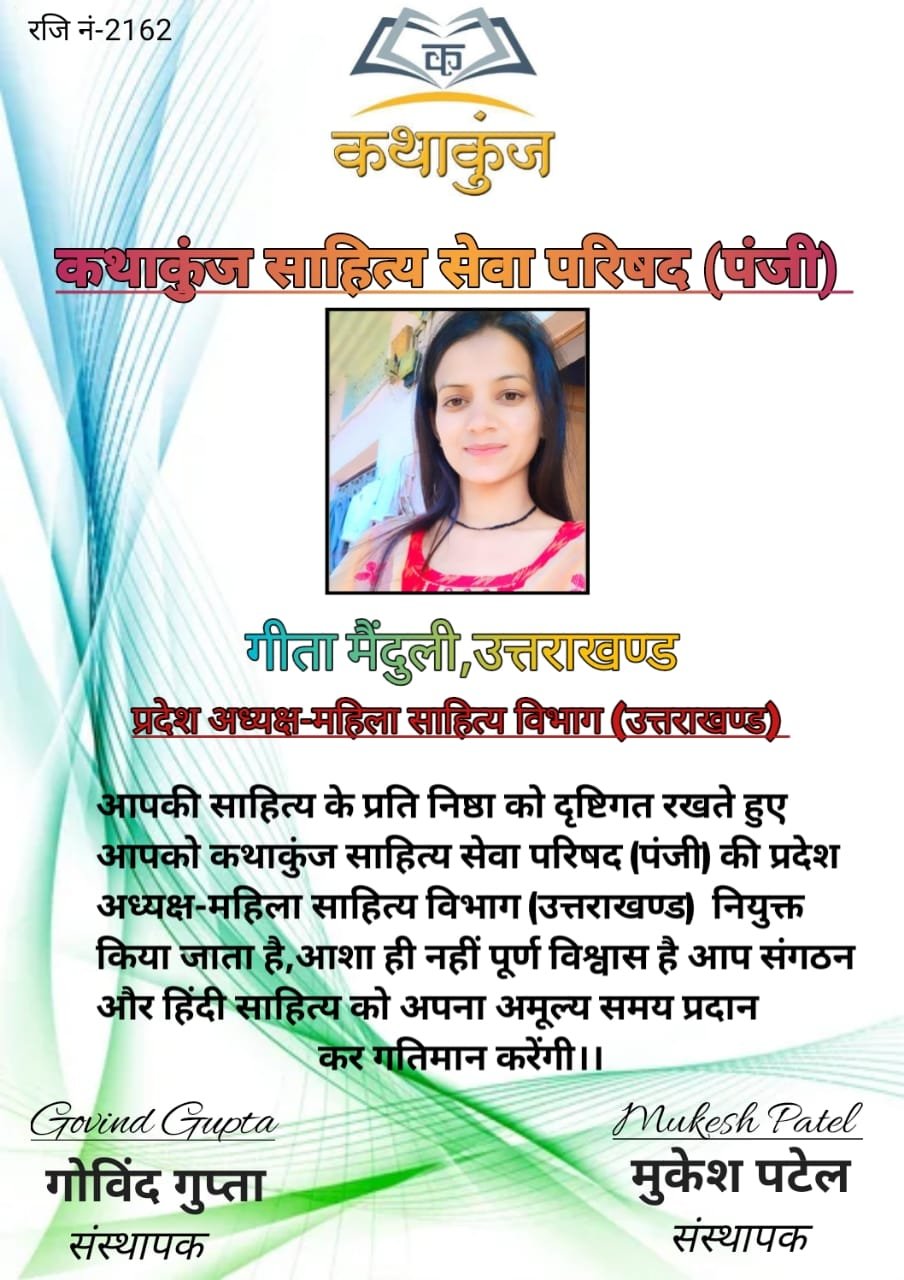 अंतरराष्ट्रीय स्तर पर कई साहित्यकार बने संरक्षक, कथाकुंज साहित्य सेवा परिषद की कार्यकरिणी की घोषणा संस्थापक गोविन्द गुप्ता व मुकेश पटेल ने कर दी है जिसमे देश ही नही विदेश से भी कई साहित्यकारों को संरक्षक मंडल में स्थान मिला है। साथ ही उत्तराखंड राज्य से प्रदेश अध्यक्ष महिला साहित्य विभाग गीता मैंदुली को नियुक्त किया गया है गीता मैंदुली विगत कई वर्षों से साहित्य की सेवा कर हिन्दी भाषा को और अधिक समृद्ध बनाने के लिए अपना महत्वपूर्ण योगदान दे रही हैं संस्था का मुख्य उद्देश्य निस्वार्थ भाव से साहित्य की सेवा कर करे साहित्यकारों को मंच देना और सामाजिक कार्यों को बढ़ावा देना है । विगत वर्ष 2022 में कथाकुंज साहित्य सेवा परिषद द्वारा देश भर में से 11 प्रतिभाओं को केतकी साहित्य रत्न सम्मान से सम्मानित किया गया जिसमे उत्तराखंड से गीता मैंदुली को ये सम्मान मिला था ।