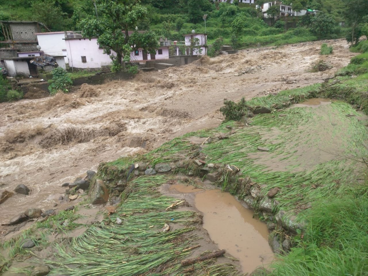 गोपेश्वर (चमोली)। चमोली जिले के नंदानगर के मोखगांव में ऊपरी इलाके में बादल फटने मोक्ष नदी में आए जलजले के कारण दो गोशालाएं क्षतिग्रस्त हो गई है जबकि 11 आवासीय भवनों को खतरा पैदा हो गया है। नदी का जलस्तर बढ़ने से गई घरों में मलवा और पानी घूस गया है।