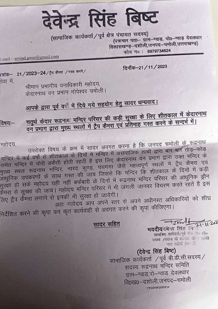 लिखित प्रार्थना पत्र में मंदिर की निगरानी ड्रोन कैमरे से करने तथा मंदिर परिसर में ट्रैप कैमरे लगाये जाने की माँग करते हुए समाज सेवी देवेंद्र सिंह बिष्ट ने बताया कि शीतकाल में मंदिर के कपाट बंद रहने के दौरान पूर्व में कई बार मंदिर परिसर की धर्मशालाओं के साथ ही गर्भ गृह में भी तोड़-फोड़ की घटनाए घटित हो चुकी है। भविष्य में इस प्रकार की घटनाओं की पुनरावृति न हो इसके लिए विभाग द्वारा धाम में बर्फवारी से पहले ही सुरक्षा के सभी ऐतिहाती प्रबंध किये जाने चाहिए।