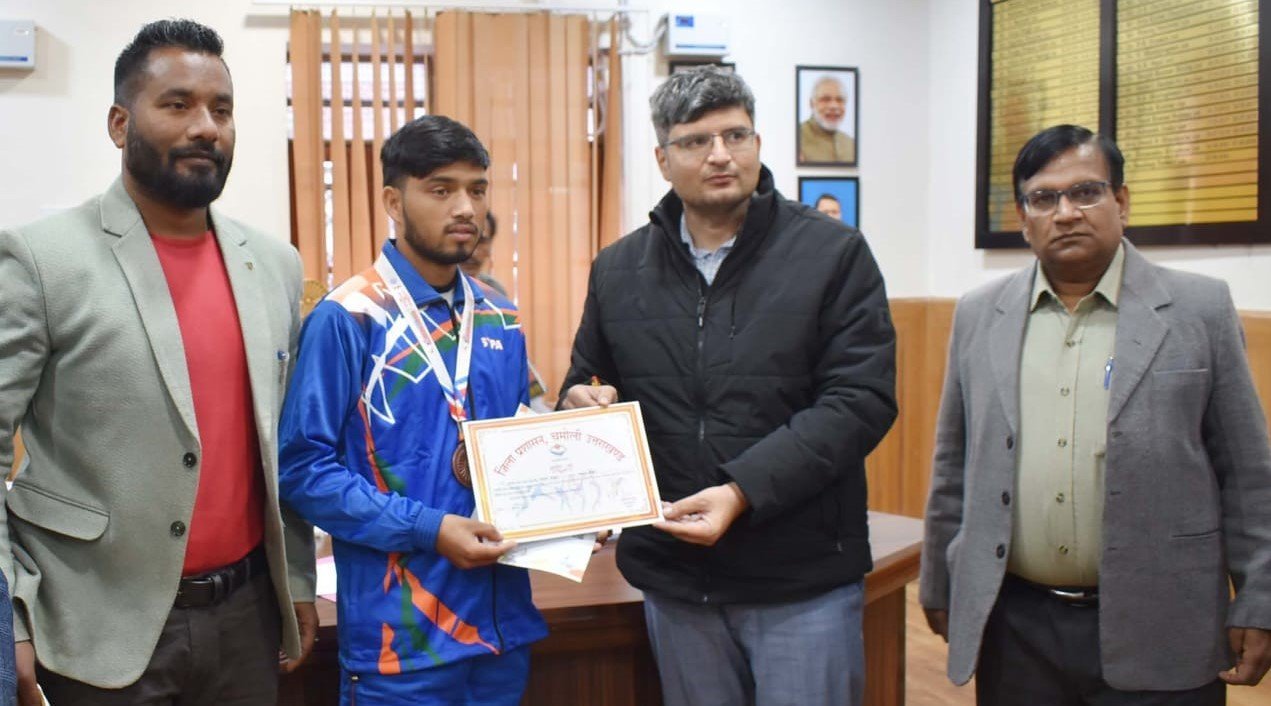 गोपेश्वर (चमोली)। सीमांत जनपद चमोली के अमन ठाकुर ने 60वीं विद्यालयी राष्ट्रीय एथलेटिक्स प्रतियोगिता के तहत अंडर-17 वॉक रेस इवेन्ट में ब्रॉन्ज मेडल जीतकर जनपद का नाम गौरवान्वित किया है। विद्यालयी राष्ट्रीय खेलों में ब्रॉन्ज मेडल जीतने पर बुधवार को जिलाधिकारी संदीप तिवारी ने एथलीट अमन ठाकुर, उनके कोच गोपाल सिंह बिष्ट और स्कूल के प्रधानाचार्य दिनेश मैठाणी को सम्मानित किया और खिलाड़ी अमन ठाकुर को उनके उज्जवल भविष्य के लिए शुभकामनाएं भी दी।