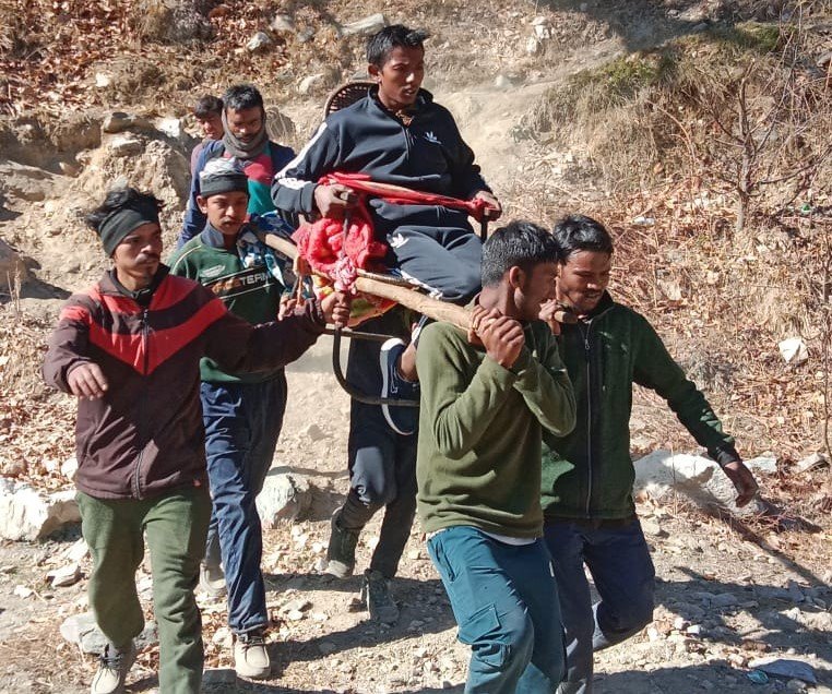 मंगलवार को भी गांव निवासी 18 वर्षीय सूरज कुमार पुत्र नैन राम की तबीयत अचानक खराब होने पर उसे ग्रामीणों ने कुर्सी पर डंडे बांध कर डंडी बनाई और पांच किलोमीटर रास्ते से पैदल चलकर काली ताल रोड तक पहुंचा। जहां से 108 सेवा से देवाल अस्पताल पहुंचाया गया।