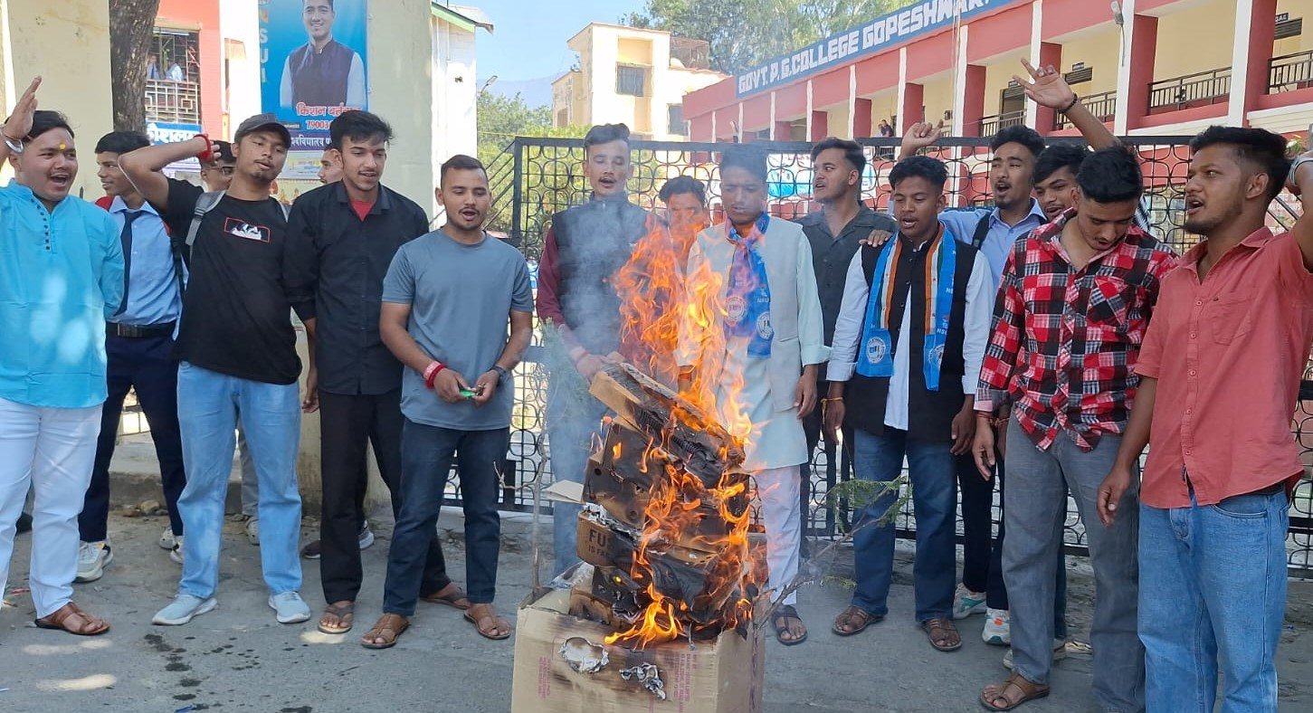 गोपेश्वर (चमोली)। श्रीदेव सुमन विश्वविद्यालय की ओर से वर्तमान समय तक महाविद्यालयों में छात्र संघ चुनाव की तिथि घोषित न किये जाने के विरोध में मंगलवार को भारतीय राष्ट्र छात्र संगठन (एनएसयूआई) ने महाविद्यालय गोपेश्वर के गेट पर कुलपति का पुतला दहन कर अविलंब छात्र संघ चुनावों की तिथि घोषित किये जाने की मांग की है। तथा महाविद्यालय के प्राचार्य के माध्यम से एक ज्ञापन कुलपति को भेजा है।