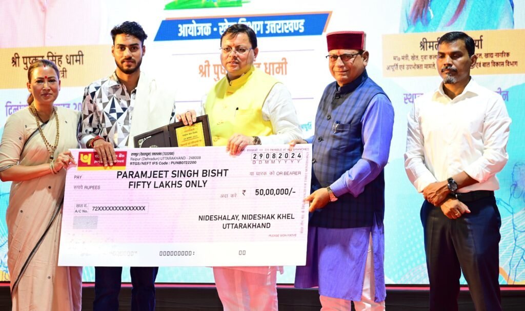 देहरादून ।  मुख्यमंत्री  पुष्कर सिंह धामी ने गुरुवार को बहुउद्देशीय क्रीडा भवन, परेड ग्राउंड देहरादून में राष्ट्रीय खेल दिवस के अवसर पर आयोजित कार्यक्रम में सभी को खेल दिवस की शुभकामना दी तथा हॉकी के जादूगर के चित्र पर माल्यार्पण कर उन्हें श्रद्धांजलि अर्पित की। इस अवसर पर मुख्यमंत्री ने पेरिस ओलंपिक 2024 में प्रतिभाग करने वाले उत्तराखंड के 4 खिलाड़ियों ( लक्ष्य सेन, परमजीत सिंह, सूरज पंवार, अंकिता ध्यानी ) को 50 – 50 लाख की धनराशि के चेक प्रदान किये।