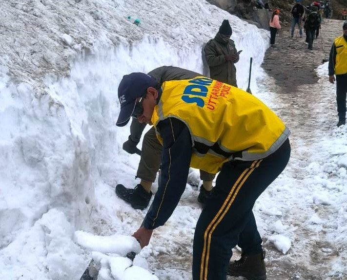 गोपेश्वर (चमोली)। सिखों के पवित्र धाम हेमकुंड साहिब-लोकपाल की यात्रा को सुगम और सुरक्षित बनाने के लिए पुलिस तथा एसडीआरएफ के जवान रास्ते से बर्फ हटाकर आवाजाही आसान कर रहे है।