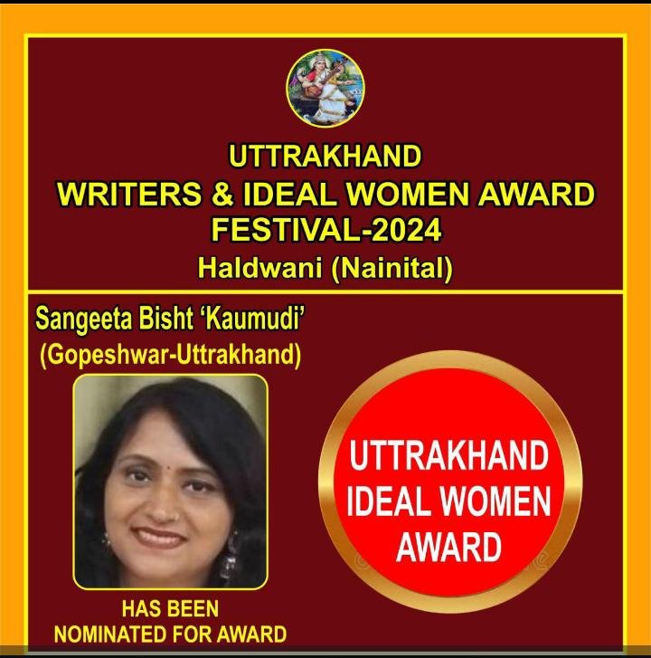 उत्तराखंड राइटर्स एंड आइडियल वोमेन अवार्ड फेस्टिवल 2024 में विश्व हिन्दी रचनाकार मंच ने संगीता बिष्ट ‘कौमुदी’ को उत्तराखंड आइडियल वोमेन अवार्ड से सम्मानित किया। यह अवार्ड उनकी साहित्यिक और सामाजिक योगदान के लिए दिया गया। संगीता जी ने अपने साहित्यिक कार्यों से उत्तराखंड की संस्कृति और महिला सशक्तिकरण को बढ़ावा दिया है।