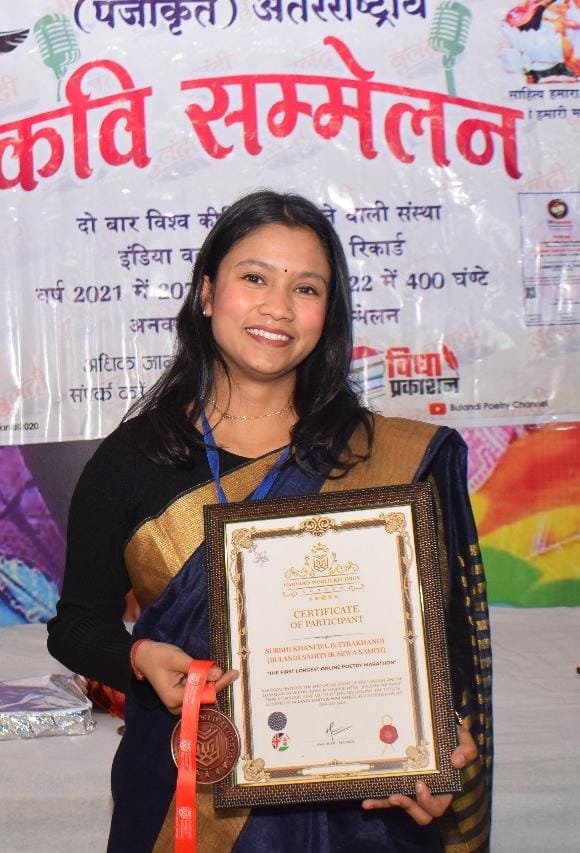 गोपेश्वर(चमोली)। दुनिया के सबसे बड़े कवि सम्मेलन में प्रतिभाग कर विश्व रिकॉर्ड में अपना नाम दर्ज करवा कर गोपेश्वर की युवा कवयित्री सुरभि खनेड़ा ने बढ़ाया शहर का मान बुलंदी संस्था द्वारा विश्व हिंदी दिवस से प्रारंभ हिंदी की वैश्विक यात्रा बुलंदी पर हिंदी अनवरत कवि सम्मेलन को हॉवर्ड वर्ल्ड रिकॉर्ड द्वारा विश्व रिकॉर्ड में सम्मिलित किया गया है उक्त आयोजन में दुनिया के 55 देशों के हिंदी कवियो सहित 1205 कलमकारो ने प्रतिभाग किया साथ ही यह आयोजन 220 घंटे अनवरत आयोजित हुआ l हॉवर्ड वर्ल्ड रिकॉर्ड द्वारा सबसे ज्यादा देशों की सहभागिता सहित अनवरत 220 घंटे आयोजित होने पर यह आयोजन विश्व रिकॉर्ड में सम्मिलित किया गया है l उक्त आयोजन में काव्य पाठ हेतु शहर की युवा कवयित्री सुरभि खनेड़ा को निमंत्रण संस्था के संस्थापक अंतरराष्ट्रीय कवि बादल बाजपुरी एवं संरक्षक अंतरराष्ट्रीय कवि पंकज प्रकाश द्वारा आमंत्रित किया गया है l बुलंदी संस्था ने वर्ष 2021 और 2022 में 207 घंटे और 400 घंटे अनवरत वर्चुअल कवि सम्मेलन आयोजित करवाकर तीन बार विश्व वर्ल्ड रिकॉर्ड बना चुकी है lजिससे इंडिया वर्ल्ड रिकॉर्ड में भी दर्ज किया गया , बुलंदी संस्था उत्तराखंड के बाजपुर से संचालित होती हैं, जिसका उद्देश्य नवोदित कलाकारों को मंच प्रदान करना है और इसके लिए संस्था निस्वार्थ भाव से कार्य कर रही हैं। बहुत ही कम समय में बड़े -बड़े आयोजन आयोजित करवा कर बुलंदी संस्था ने अपने नाम को सार्थक कर दिया है संस्था का यह तीसरा वर्ल्ड रिकॉर्ड साहित्य जगत की सुर्खियों में बना हुआ है l